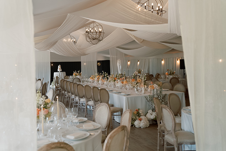 Waltzing out of the drawing room doors you will be met with sweeping sea views as you explore the gardens and grounds. Our Main Sail provides a soft canopy to cover up to 180 guests as you say your vows, or you can opt for a more intimate ceremony on the Circular Lawn tucked amongst stunning florals.