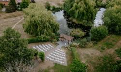 The picturesque lakeside ceremony area, situated near the venue in the heart of the expansive 360 acre estate, offers an ideal setting for your civil wedding or partnership. Surrounded by rolling countryside hills and fields, it provides a stunning backdrop for your special day. Following the ceremony, you can enjoy drinks and canapés on the patio while your wedding photos are captured. With various enchanting photo opportunities such as the island bridge, tree bench swing, lawns, flower beds, and fields, you can create cherished memories in this idyllic location. Outdoor weddings can accommodate up to 150 guests and are available from March to October, depending on the weather. In case of unsuitable weather conditions, the ceremony can be held in the Barn.